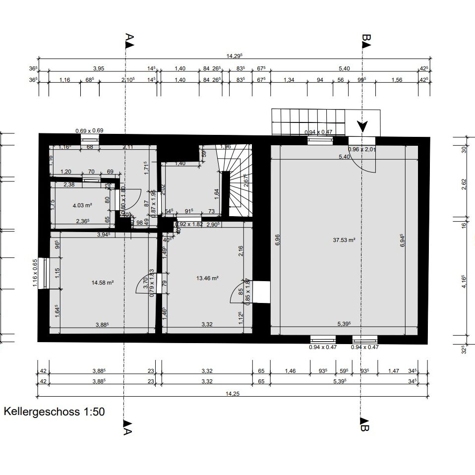 Aus den erfassten 3D-Laserscandaten erstelle ich präzise 2D-Schnittzeichnungen des Bestandsgebäudes.
