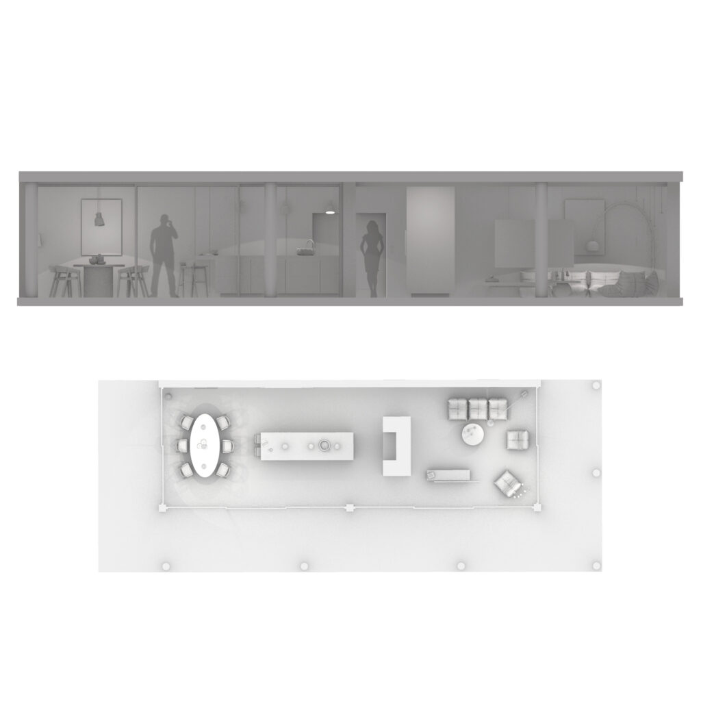 Für die Penthousewohnung mit umlaufender Terrasse wurde ein präzises Aufmaß erstellt, um die gesamte Wohn- und Außenflächengeometrie exakt zu erfassen. Auf Basis dieser Bestandsdaten wurden ein detailliertes Gebäudemodell sowie 2D-Planunterlagen generiert, die dem Bauherrn als proportionale Entscheidungsgrundlage für die weitere Planung dienen. Ergänzend wurde ein architektonisches Rendering zur Konzeptidee „Privates Wohnen“ entwickelt, um räumliche Qualitäten und Gestaltungsmöglichkeiten anschaulich darzustellen.